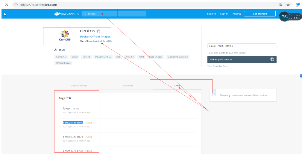 单击centos镜像,查看镜像标签,这里我们下载标签名为centos7.6.1810的版本,命令为docker pull centos:centos7.6.1810,镜像名:标签名如果为latest,那么下载最新版本