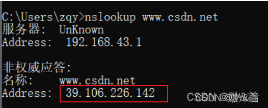 ????????用来查看域名和IP的对应关系。它通常需要一台域名服务器来提供域名。如果用户已经设置好域名服务器,就可以用这个命令查看不同主机的IP地址对应的域名。