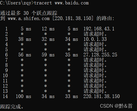 ?????????跟踪路由信息,使用此命令可以查出数据从本地机器传输到目标主机所经过的所有途径,这对我们了解网络布局和结构很有帮助,如果网络出现故障,就可以通过这条命令查看出现问题的位置。
