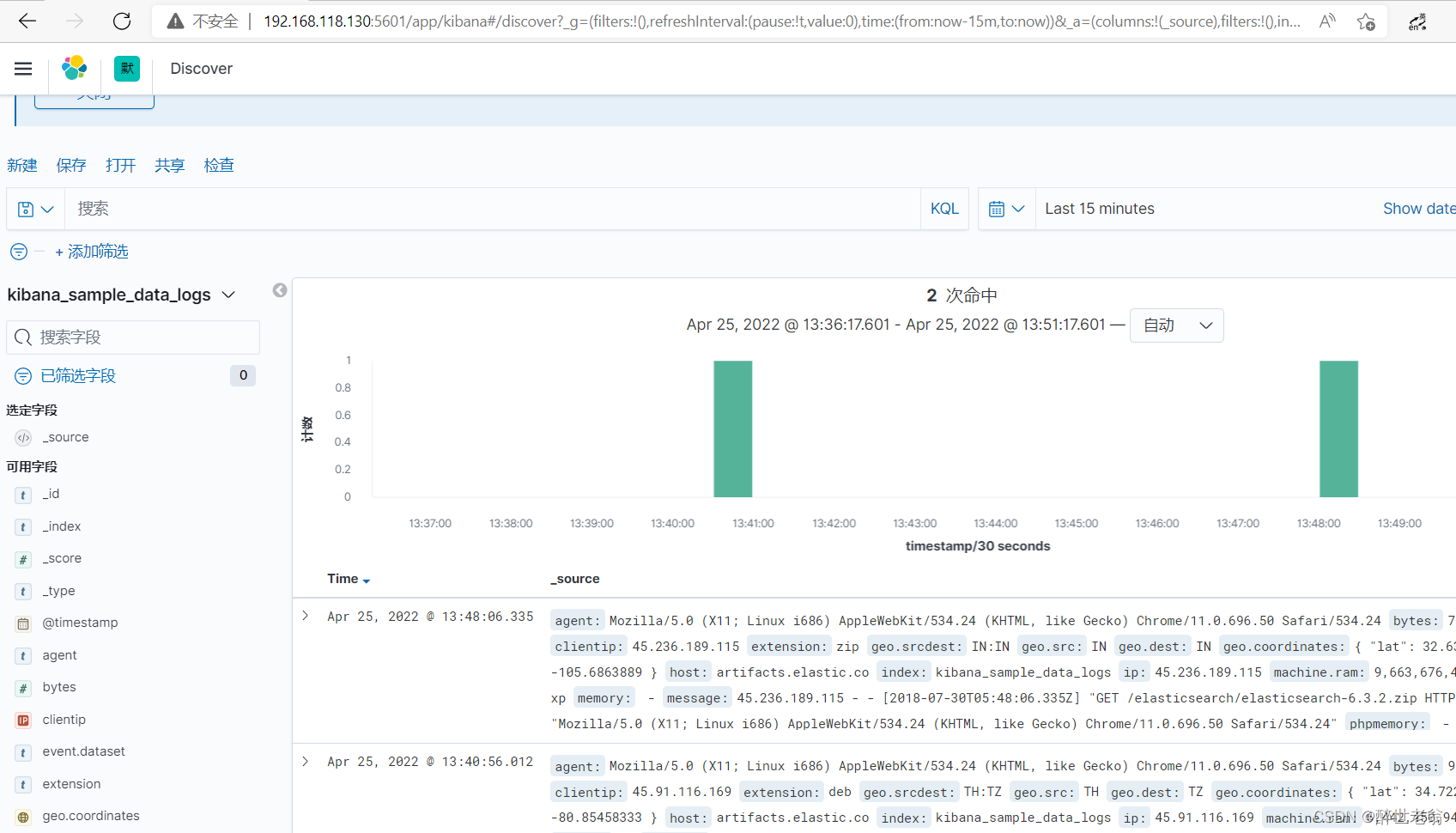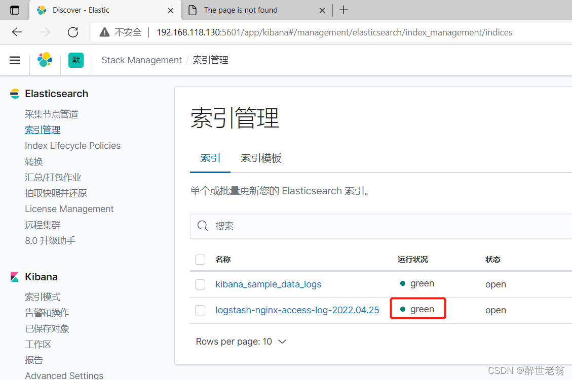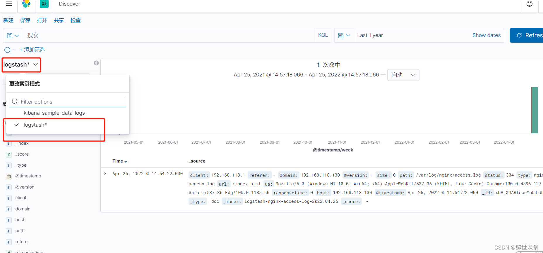 ?点击后,可能会刷不出来logstash,因为没数据,刷新两下nginx页面,产生一下数据,多等待两分钟,然后再刷新页面就会出现了(大坑,踩了很久)
