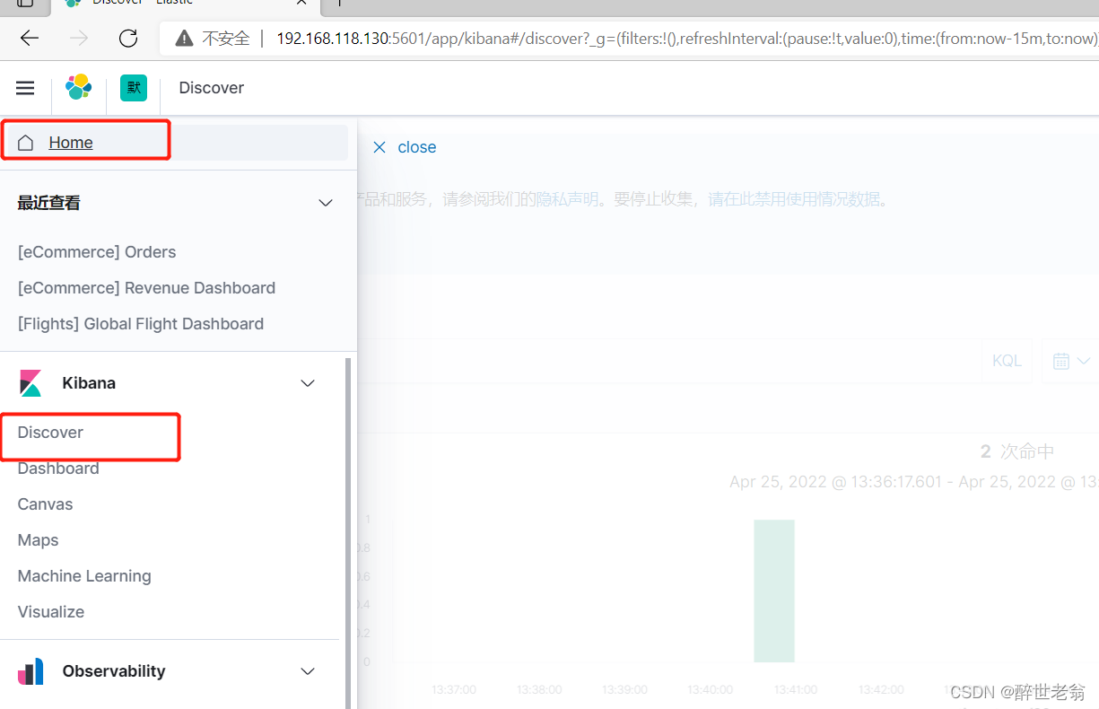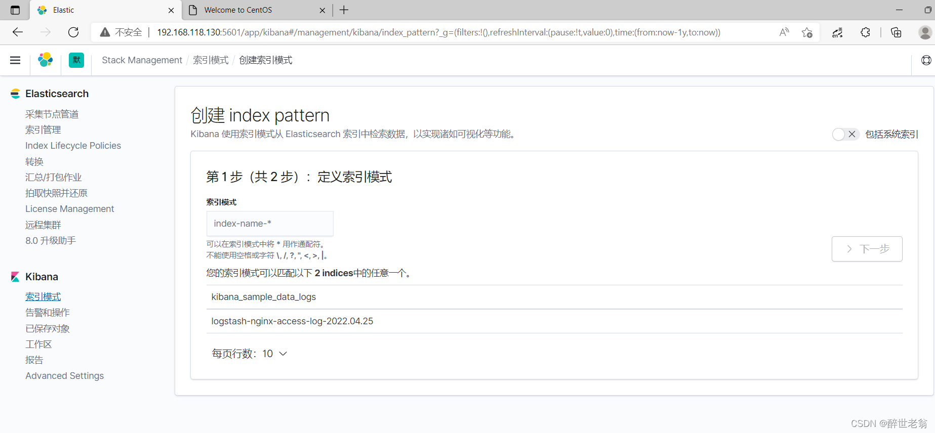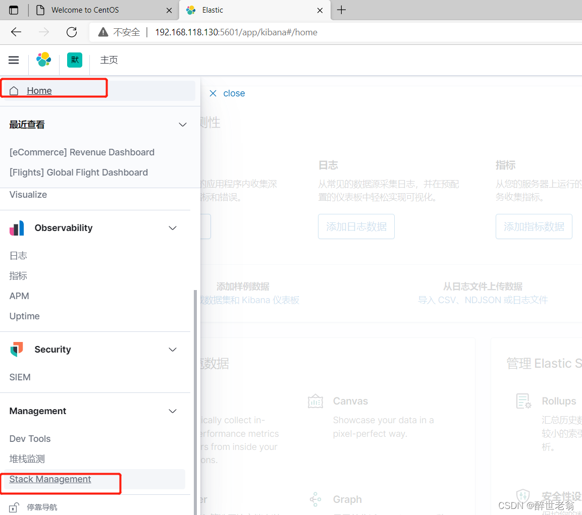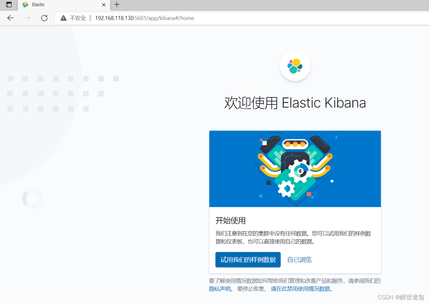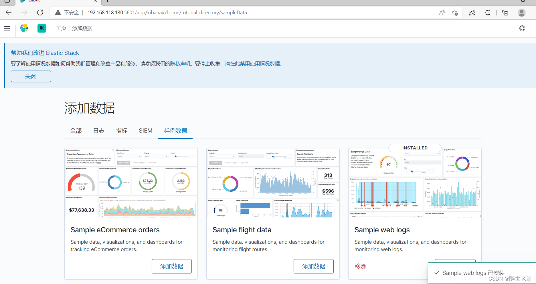 浏览器打开"192.168.118.130:5601",点击“试用我们的样例数据”,这三个可以都点击添加,不添加的话,后面会无法创建索引模式,起码创建一个。