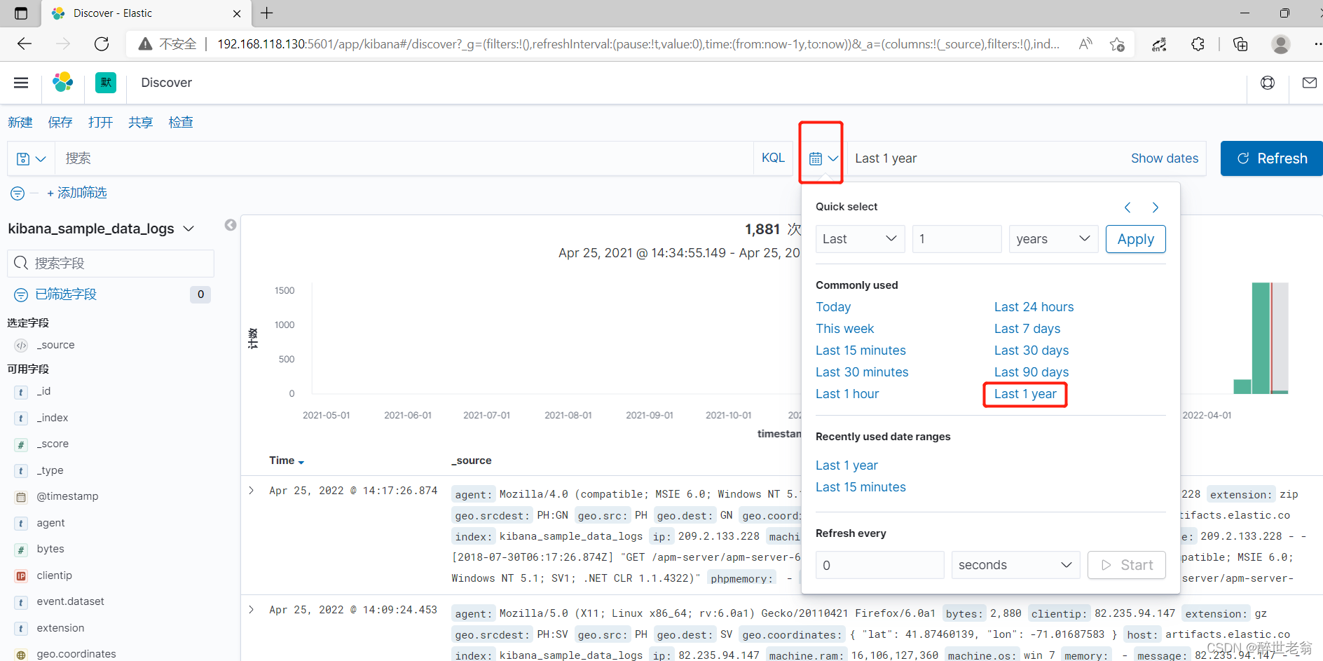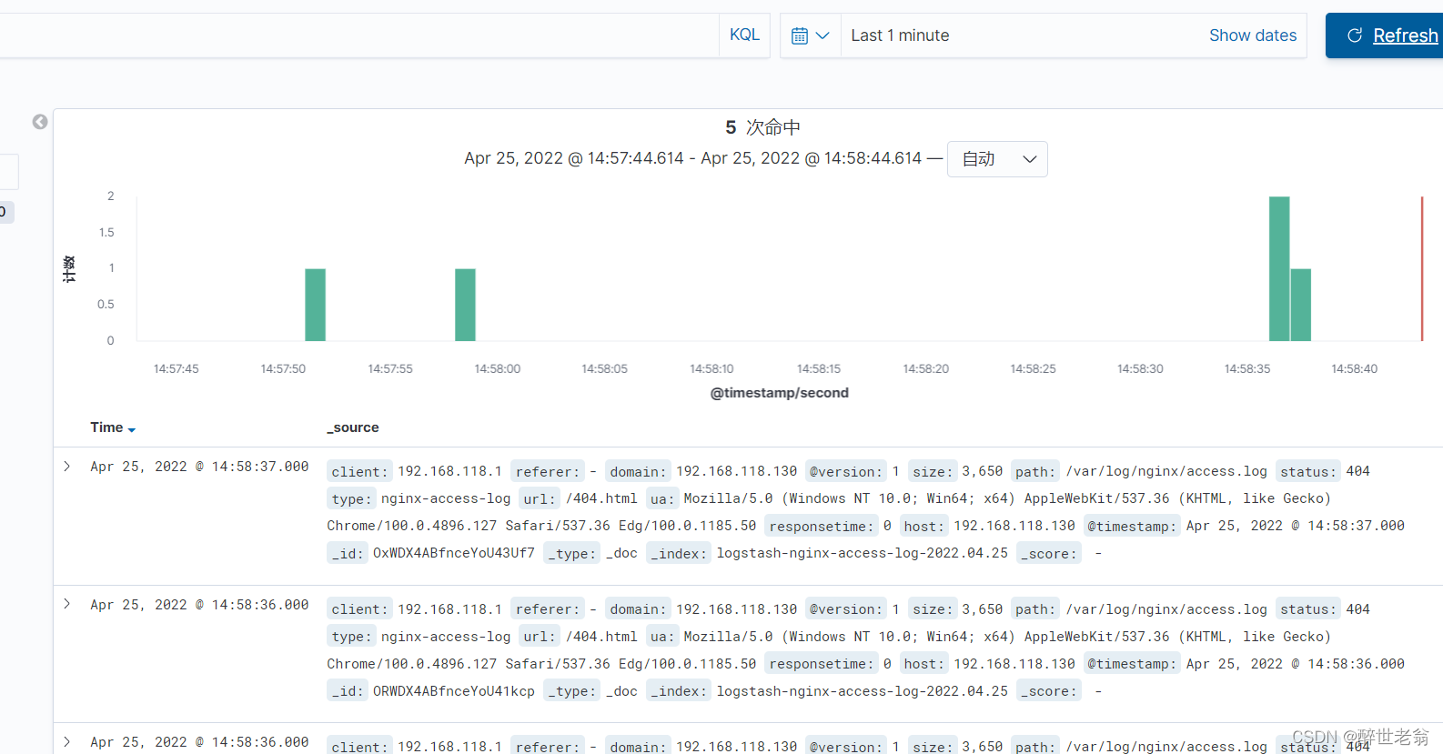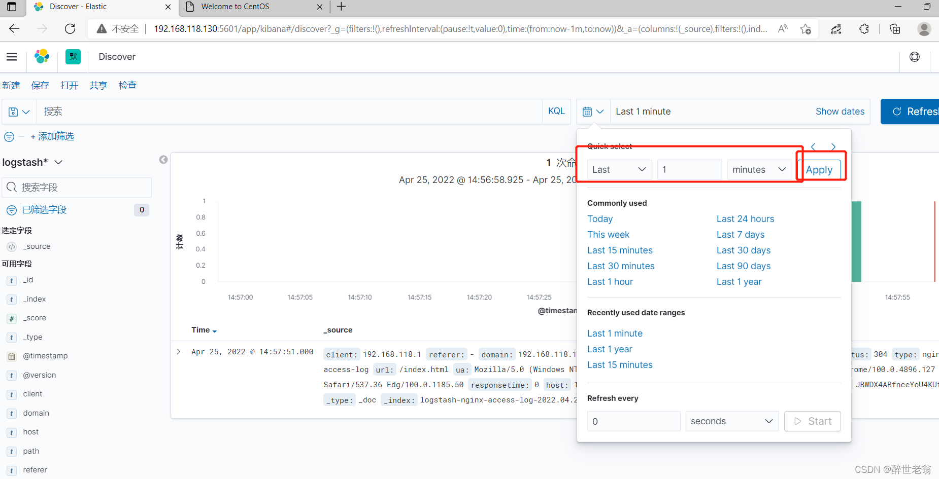刷新nginx,kibana页面也会跟着输出,如果没变化,点击Refresh