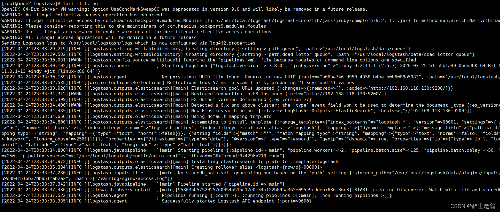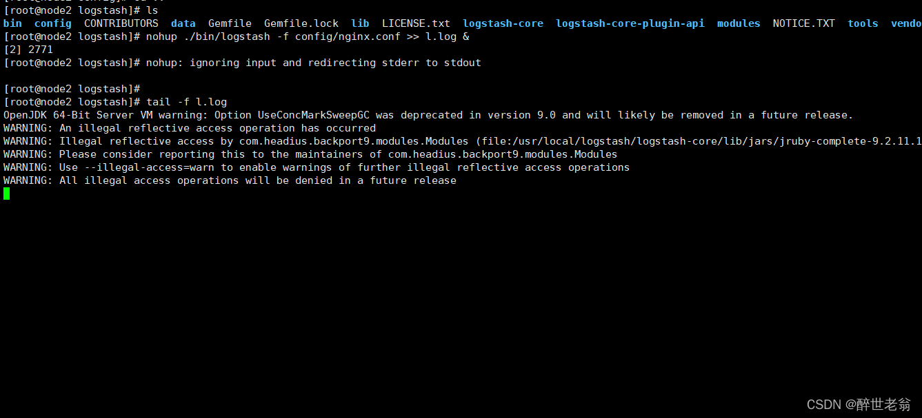 nohup ./bin/logstash -f config/nginx.conf >> l.log & #我是相对路径,如果不在这个目录下,记得打绝对路径