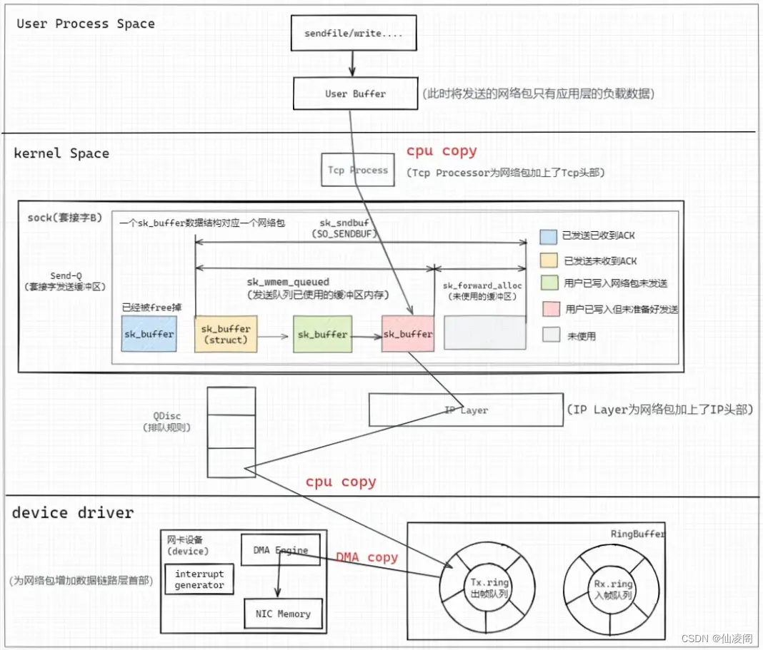 结构体中存储的是指向内存中各种协议的首部地址的指针,而在发送数据包的过程中,sk_buff中的data指针指向最外层的协议头; 网络包的大小占用 因此当发送这个网络包时: Case1:不存在缓冲区积压,则新建一个sk_buff进行网络包的发送;