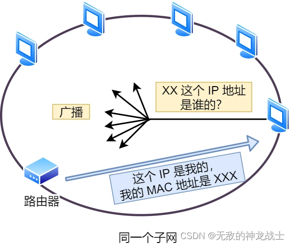 ARP 协议会在以太网中以广播的形式,对以太网所有的设备喊出:“这个 IP 地址是谁的?请把你的 MAC 地址告诉我”。