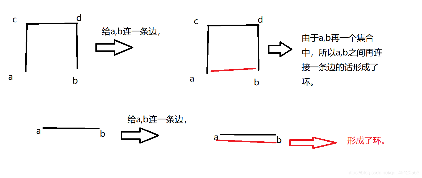 判断是否为连接一条边后组成环的话,可以使用并查集的方式,判断所连接的两个点是否已经再一个集合中了,如果两个点已经在一个集合中了,再用一条边连接这个两个点的话,必定会组成一个环,?