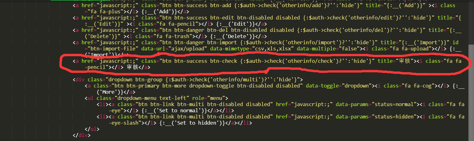 1.简介以及版本说明? ? ? ? 采用的fastadmin版本:1.2.0.20210401_full ? ? ? ? ?FastAdmin是一款基于ThinkPHP5+Bootstrap的极速后台开发框架,具有强大的功能,在后台的开发中可以显著提高后台的开发效率,同时框架本身生成的界面具有简洁和美观的特点。 ? ? ? ? 在开发的过程中,我们通常采用框架自带的按钮就可以满足后台的基本需求,但有的时候我们也会有需要用到自定义按钮的时候。因此,我们在这里介绍一下自定义批量操作按钮的生成方式以及按钮的权限注册。 2.修改html代码,生成批量操作按钮。? ? ? ? 在application\admin\view目录下找到要添加按钮的视图文件夹。在相应的位置添加按钮的代码。