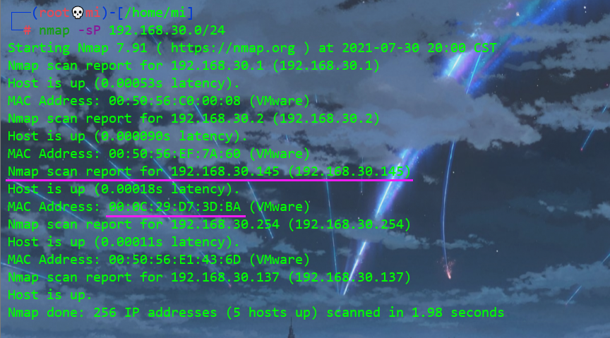 NAT模式下启动kali,使用ssh远程连接到物理机windows10(方便一点) nmap -sP 192.168.30.0/24,得知靶机ip地址为192.168.30.145
