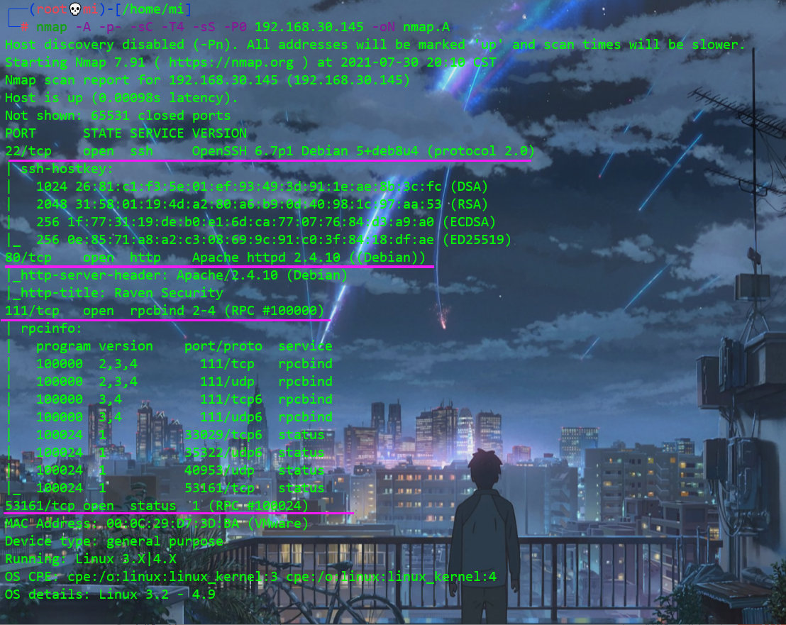 nmap -A -p- -sC -T4 -sS -P0 192.168.30.145 -oN nmap.A (nmap默认会扫描使用频率最高的top1000端口,-p-就是扫描1-65535端口,nmap可以做漏洞扫描-sC,设置扫描速度-T4,nmap扫描速度有5档T1~T5,T1最慢,T4最快,-sS做SYN半连接扫描,nmap对目标进行扫描的时候一共有两步,第一步是确定主机是否在线,第二步再进行端口扫描,-P0是禁用nmap来判断主机是否在线,直接进行强扫,直接就发包)