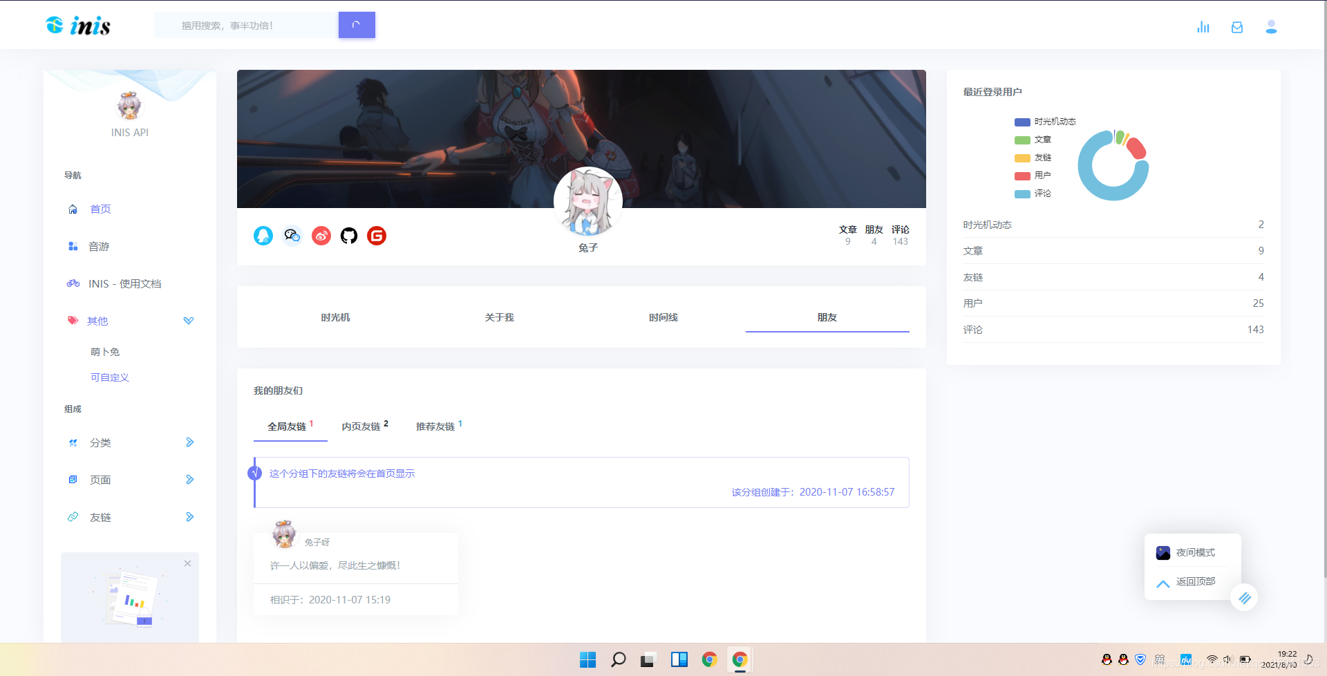 | inis · 新一代博客系统inis于2020年8月15日开始设计并着手开发,于今已有一年之久,我们终于推出了新一代的博客系统这是市面上为数不多的新一代博客系统,整站封装,全站分离,真正意义上的前后端分离。每一行代码都用心设计,用最少的代码量和最优雅架构设计,实现最完美的系统,让你拥有更极致的体验。复杂的研究留给我们,简单的体验留给用户!inis官网是inis唯一官方平台,一切版权归萌卜兔's所有,官方地址:https://inis.cc