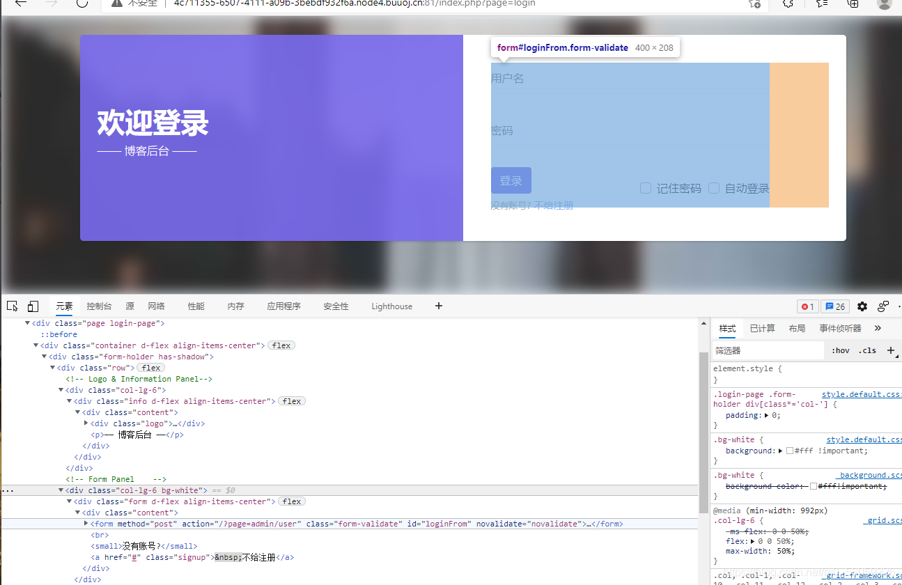 并没有看懂什么,先不急,还有个home可以读取一下原码,同样是一堆html,看不出什么端倪,这里卡住了,我在想会不会有需要扫一下文件,无聊打开了f12看了看,因为他不让注册,我总觉得问题出在注册这里,可以看到有个页面可以去看看