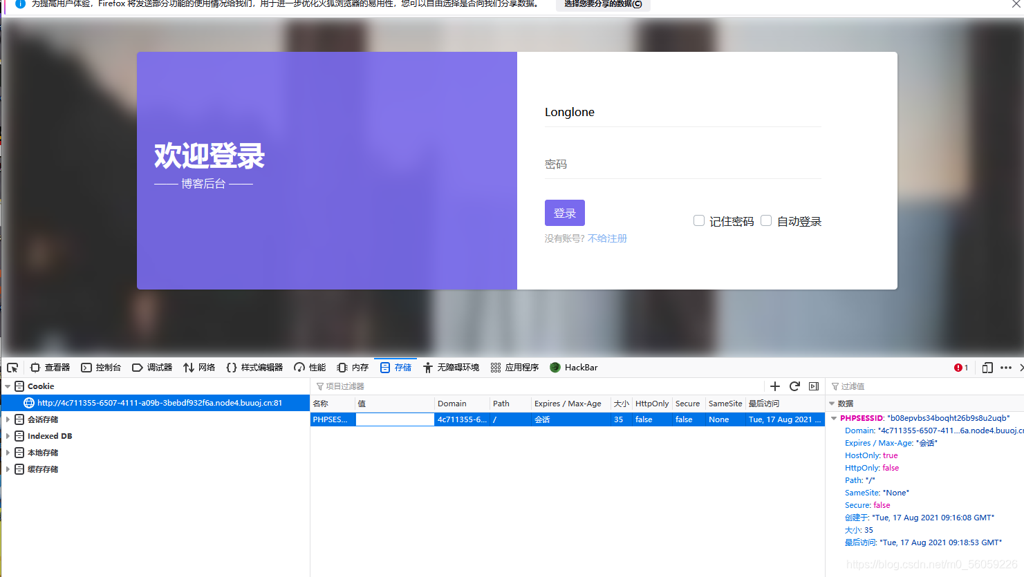 意思就是说如果我们删去了cookie,那么传进去密码将不再是longlone的密码,没有cookie就找不到是哪个用户,那么服务端存的$_SESSION['password'])也就为空了,那我们只需要也传一个空密码按道理就可以绕过了。--在火狐中会好操作一点--