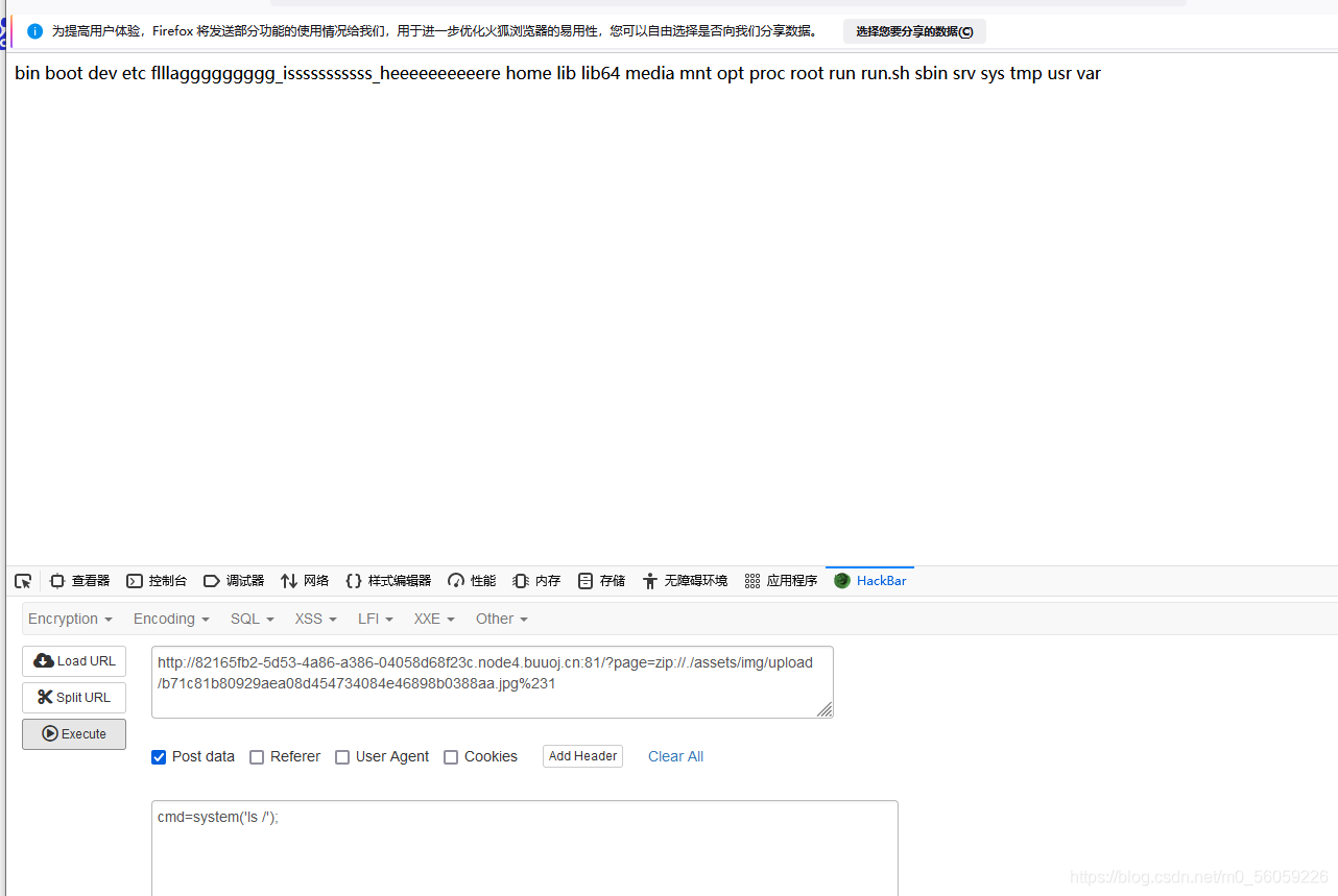 ?得到flag,本来想用蚁剑,一直连接不上我也不知道为什么,所以就直接传命令去看,也不难看到flag就在根目录下面。??