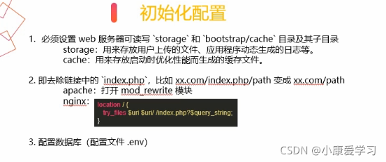 初始化配置 1.必须设置web服务器可读写'storage' 和'bootstrap/cache'目录及其子目录 storage:用来存放用户上传的文件、应用程序动态生成的日志等。 cache:用来存放启动时优化性能而生成的缓存文件。 2.即去除链接中的index.php",比如xx.com/index.php/path变成xx.com/path apache:打开mod. rewrite 模块 nginx: location 1 try_ files Suri Suri! findex php?$query, string 3.配置数据库(配置文件.env)