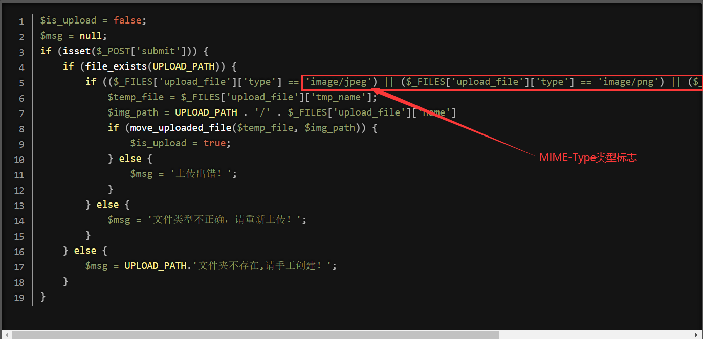 MIME-Type验证 MIME-Type介绍: MIME(Multipurpose Internet Mail Extensions)多用途互联网邮件扩展类型。是设定某种扩展名的文件用一种应用程序来打开的方式类型,当该扩展名文件被访问的时候,浏览器会自动使用指定应用程序来打开。多用于指定一些客户端自定义的文件名,以及一些媒体文件打开方式。 方法1:由pass2源码可以看到mime-type元素标签,bs代理中更改Content-Type图片类型的描述,如下图,就可以通过啦。