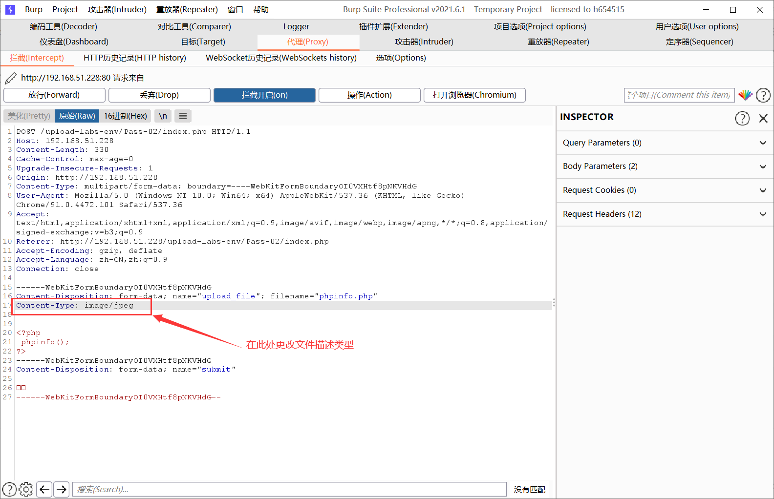 ?将 Content-Type: application/octet-stream的文件类型改为源码中允许上传的文件类型,如image/jpeg,然后放行就通关啦。