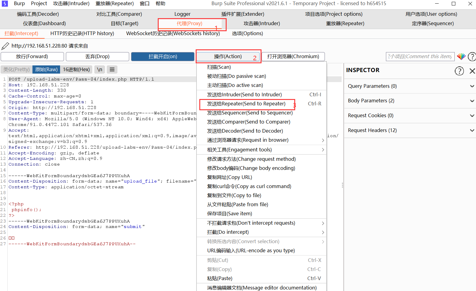 ?用bs代理,抓包,(将拦截的包发送到重发器中进行操作,防止一次操作不成功,可以多次重复操作,当然,也可以直接修改包,直接省略括号内的操作也可)