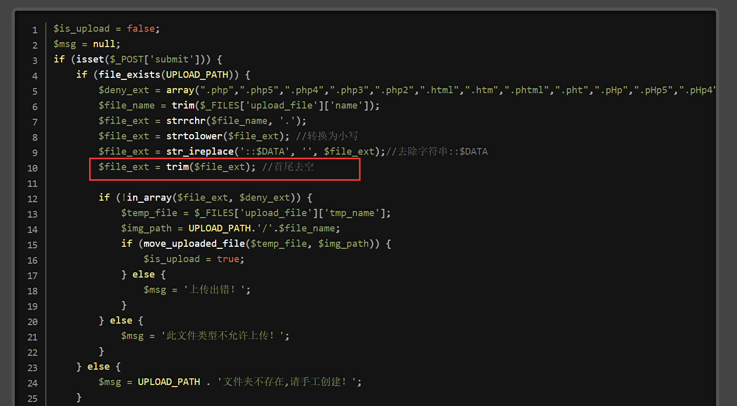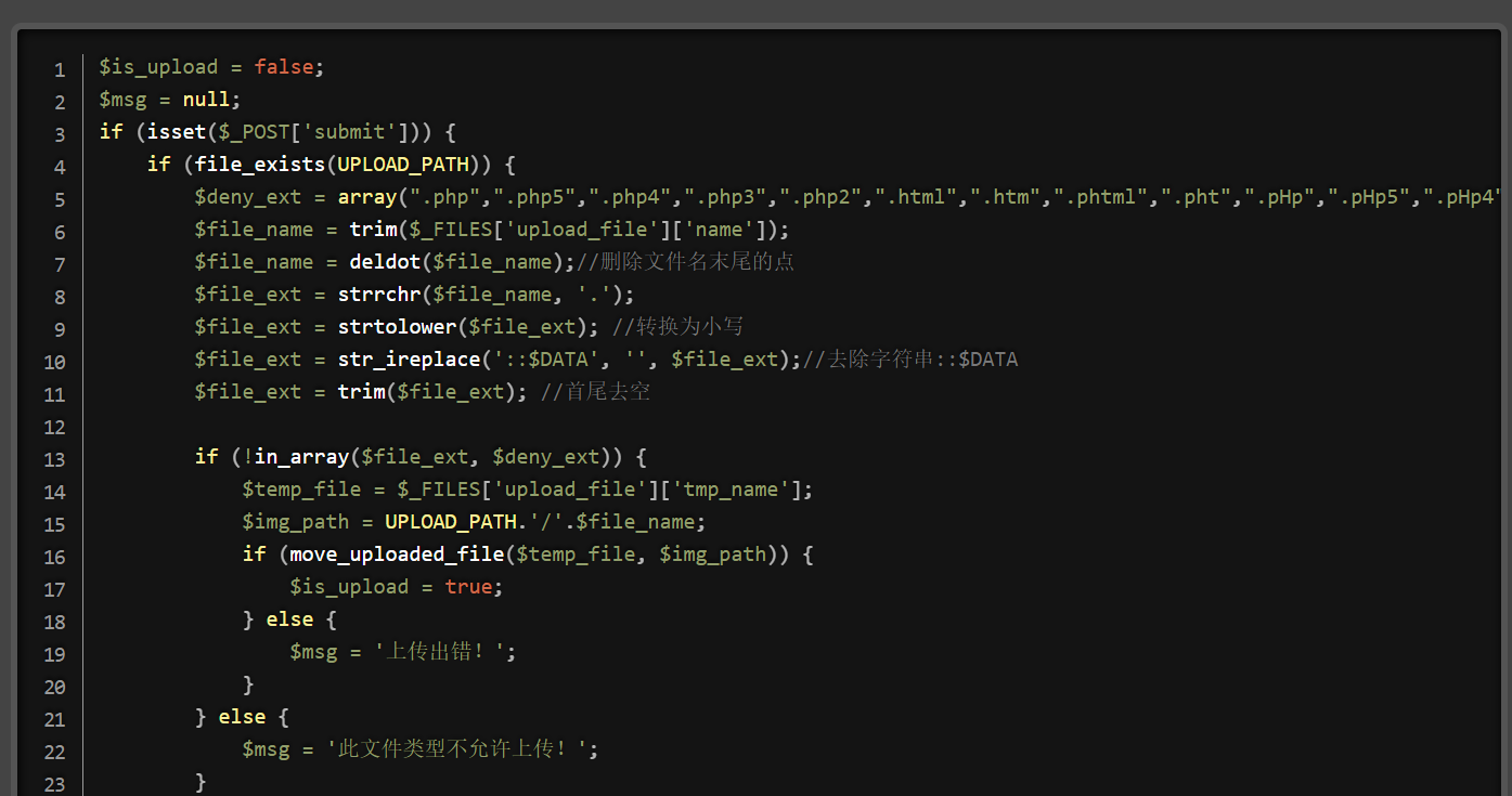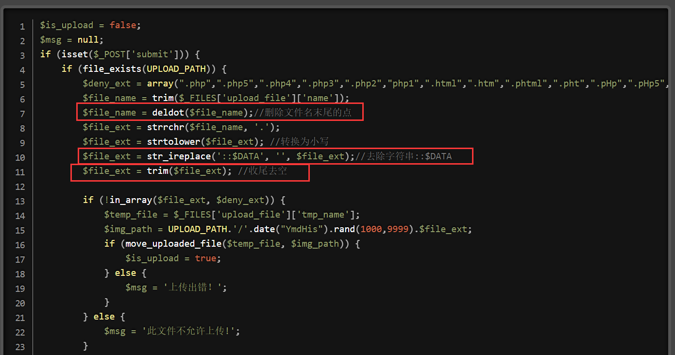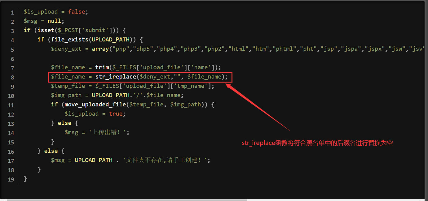 ?双写绕过 方法1:由源码可知,$deny_ext中的元素文件类型都加入上传黑名单,有该类文件上传,str_ireplace函数将文件后缀名替换为空格。