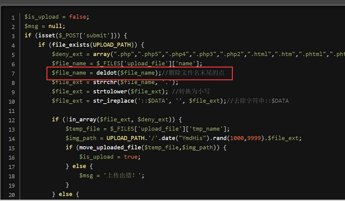 ::$DATA 绕过 NTFS文件系统包括对备用数据流的支持。这不是众所周知的功能,主要包括提供与Macintosh文件系统中的文件的兼容性。备用数据流允许文件包含多个数据流。每个文件至少有一个数据流。在Windows中,此默认数据流称为:$ DATA。 方法1:由源码看出,这关没有::$DATA字符去除,所以用该字符绕过,用bs抓包,在文件后缀加::$DATA,然后放包就通过啦。