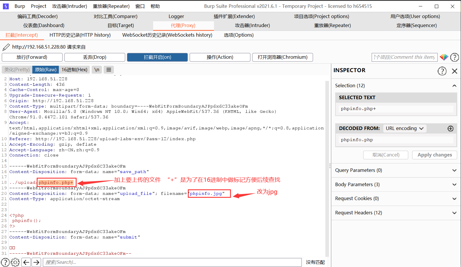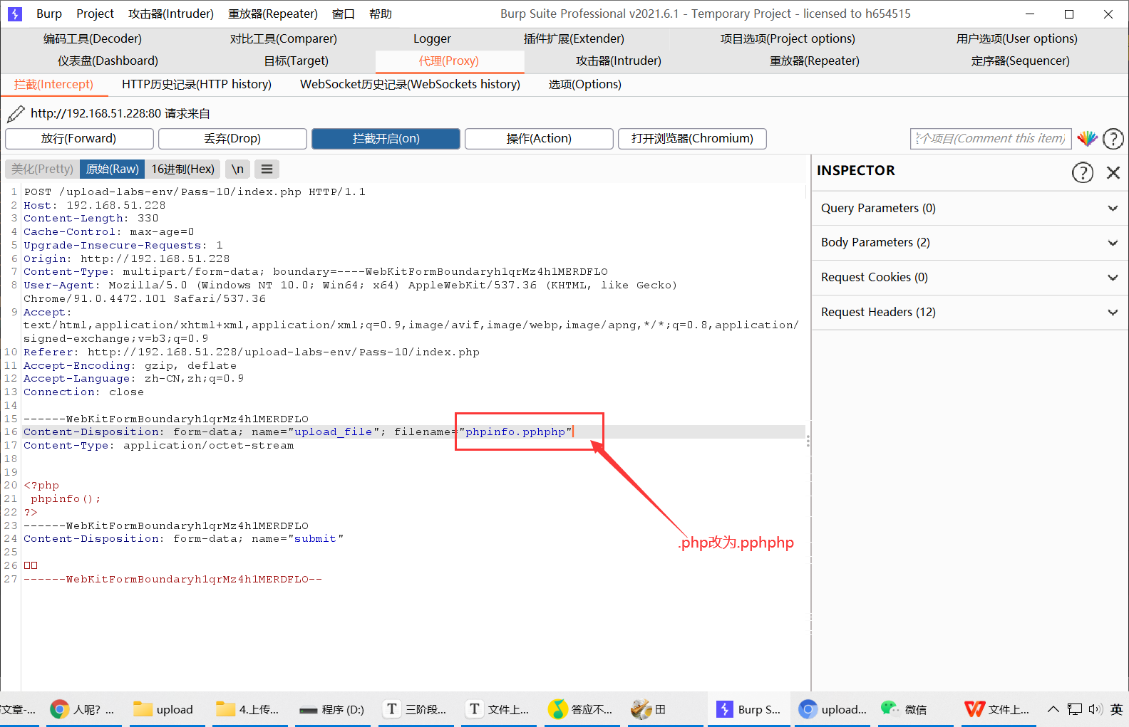 ?因此可以使用文件双写绕过,bs抓包,将文件后缀.php改为.pphphp