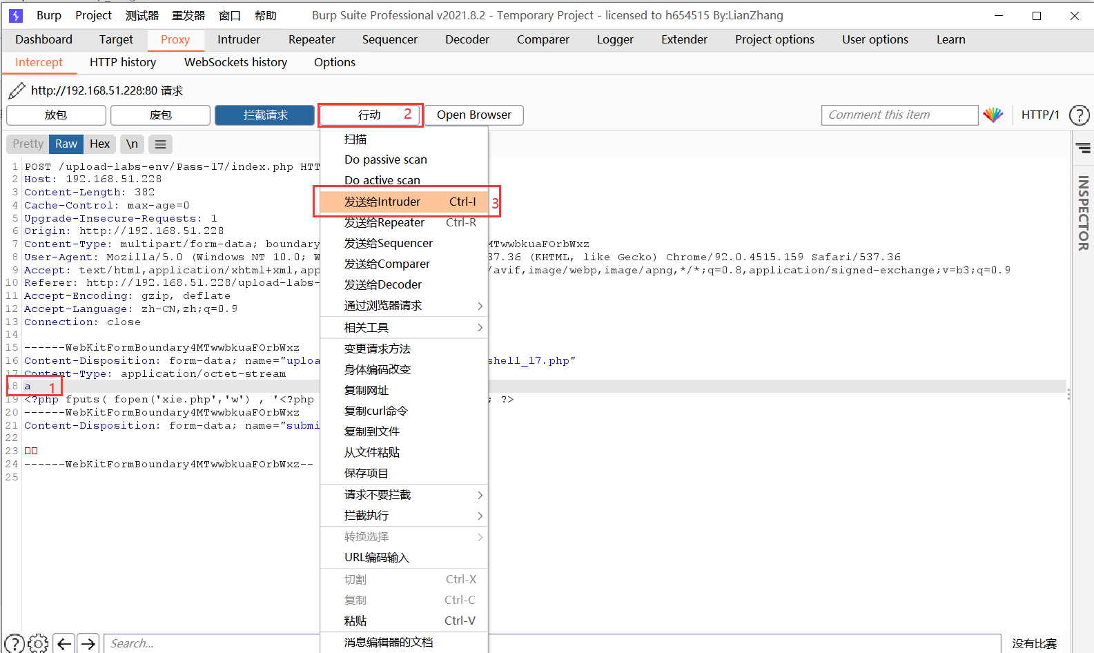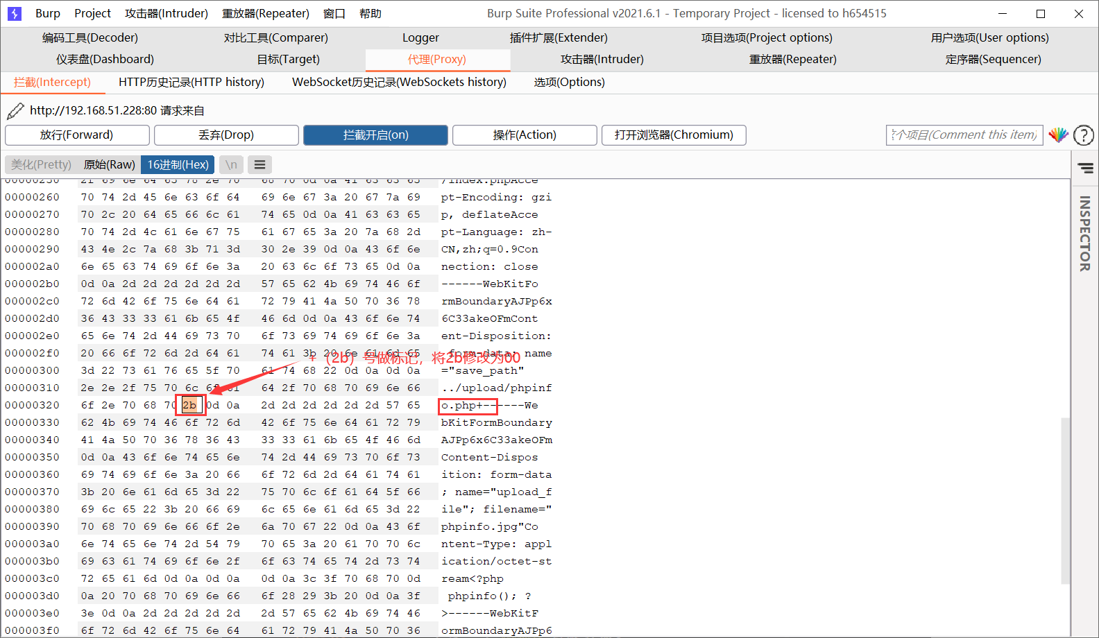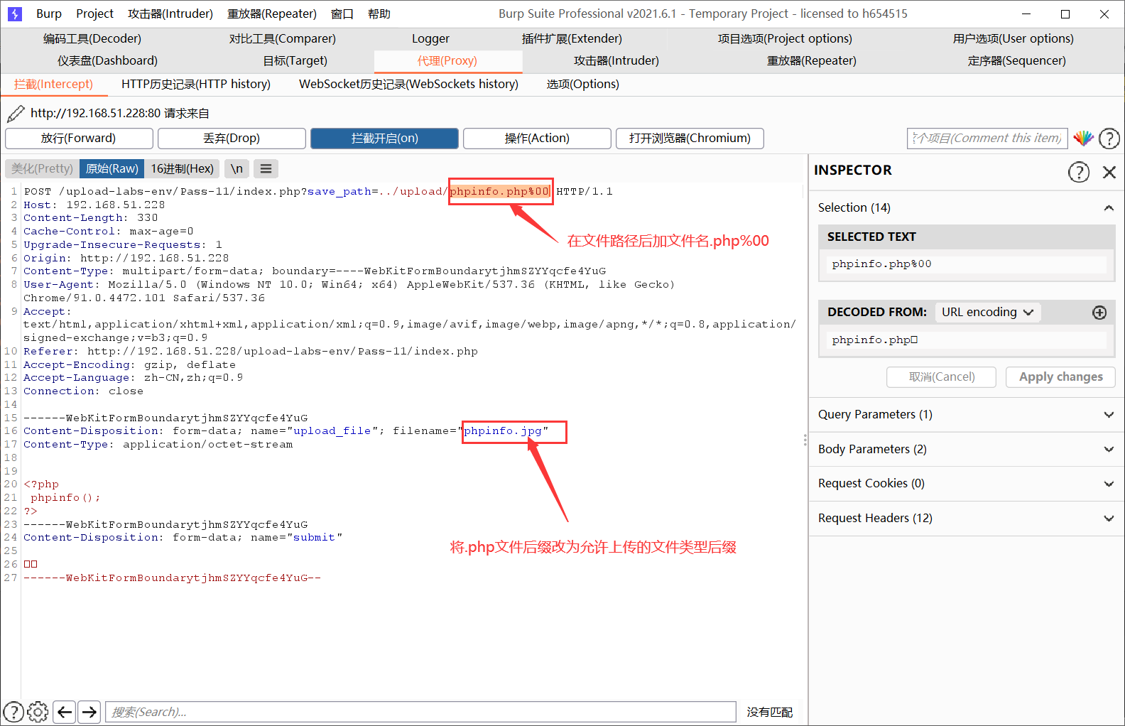 截断突破上传限制(get) 原理:和Pass-11的漏洞非常类似,唯一的不同是请求方式由GET变成了POST,%00的写法对GET有效,因为GET方式将信息提交到地址栏,%00会被转码,但是POST却不会对其进行转码,因此需要修改 HEX 信息。POST方式直接写00即可。 条件:php5.5.9版本 方法1:上传php脚本文件,用bs抓包,在文件路径后加文件名.php+(“+”作为定位标记,在16进制中为2b,方便后面操作查)再将文件名(filename)后的文件后缀改为.jpg(允许上传的文件类型)。