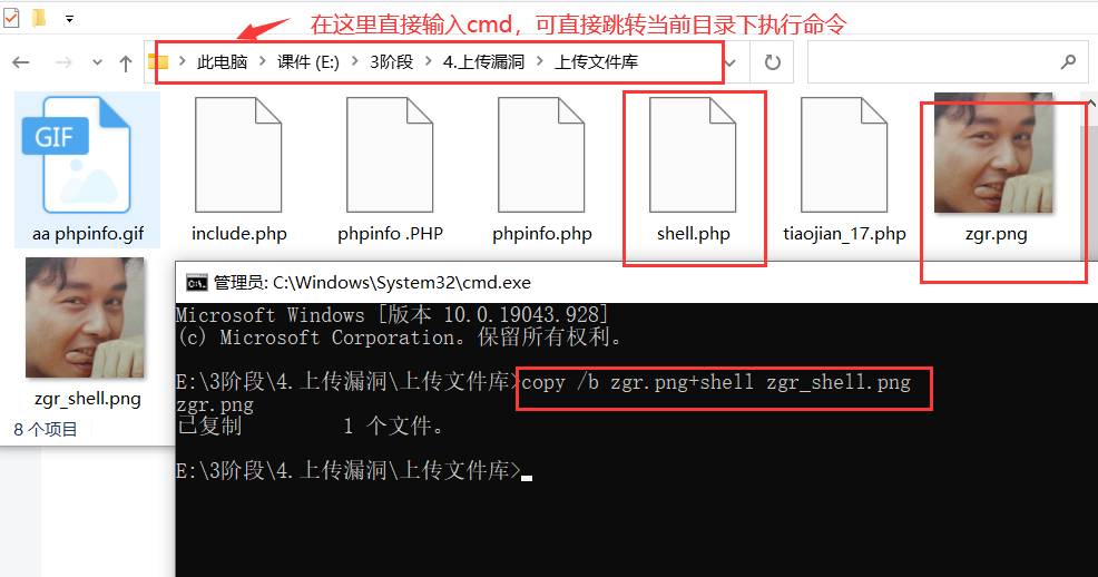 ?方法2:图片挂马:将图片和脚本放在同一目录下,执行cmd命令,在cmd中执行 copy /b 图片+php脚本 新文件名,然后直接上传伪图片zgr_shell.png
