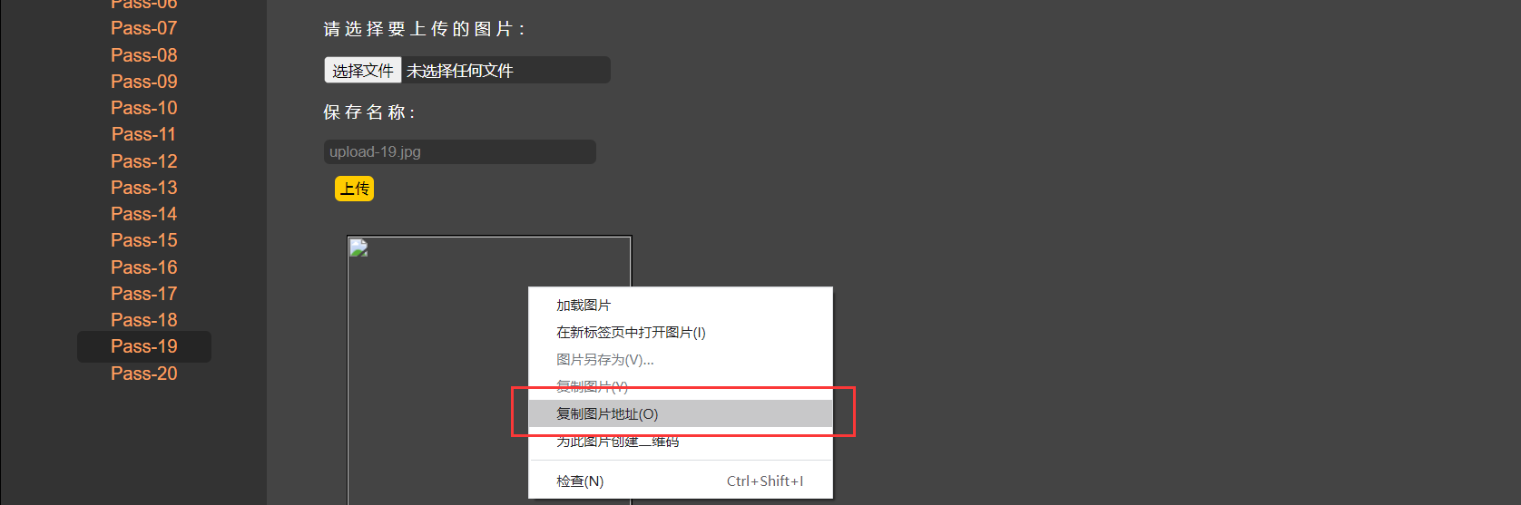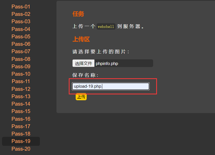 这一关相比17关,上传的文件就必须是白名单中的文件。 Pass-18.jpg是包含17关的webshell.php的内容的图片马。毕竟是先检查后缀的。 这里上传的文件以及生成的shell.php会出现在upload-labs目录中。 然后再访问http://ip/upload-labs/include.php?file=./对应的文件名。就可以生成shell.php。 也可以直接上传13~15关的那种图片马,当然也需要知道重新命名后的文件名,再利用文件包含即可。同13~15关差不多,唯一多了一步就是需要确定上传的文件的文件名以及位置。 pass-19