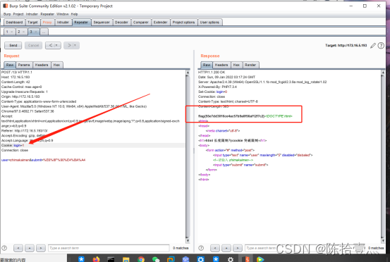 并将数据包发送到Repeater模块将login改为1后点击send发送数据包得到flag