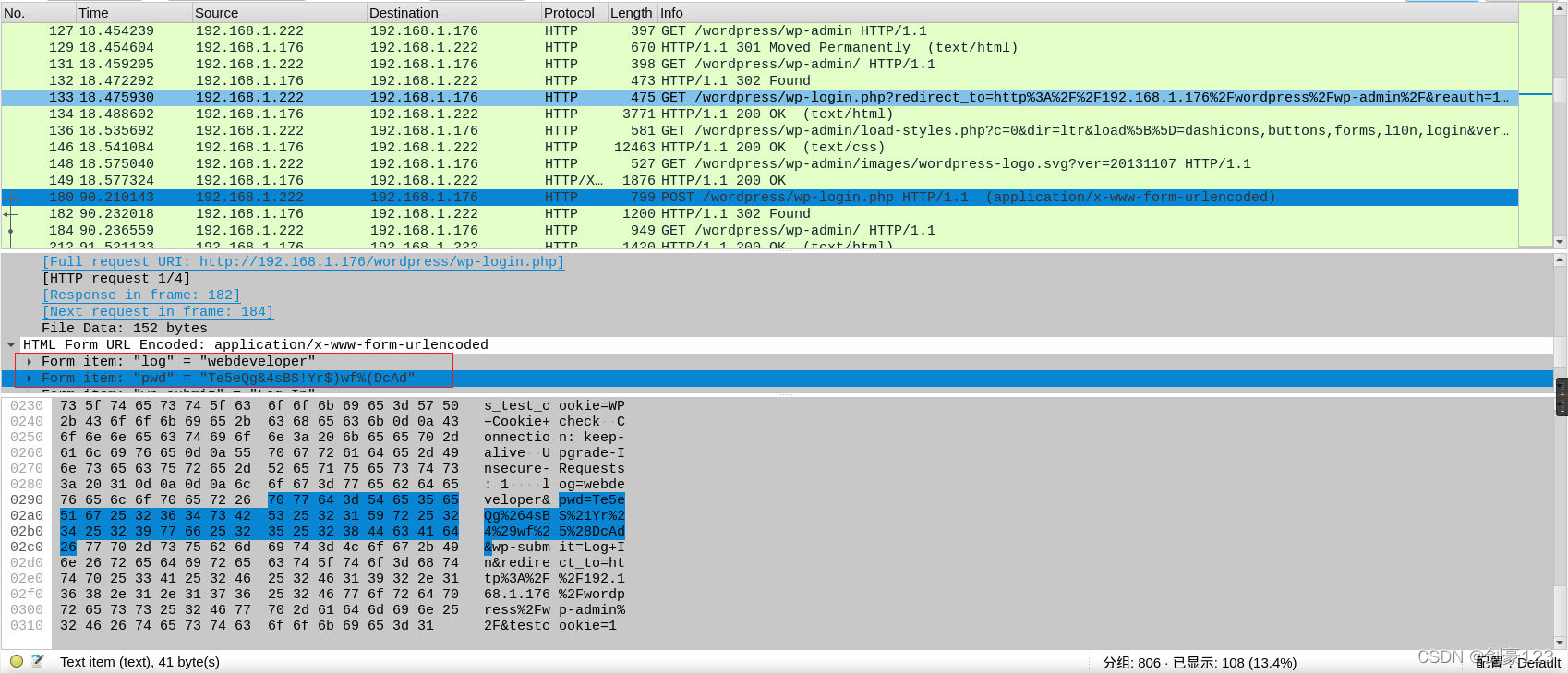 ?在180这条数据流中发现了登录信息,用户名:webdeveloper 密码:Te5eQg&4sBS!Yr$)wf%(DcAd?