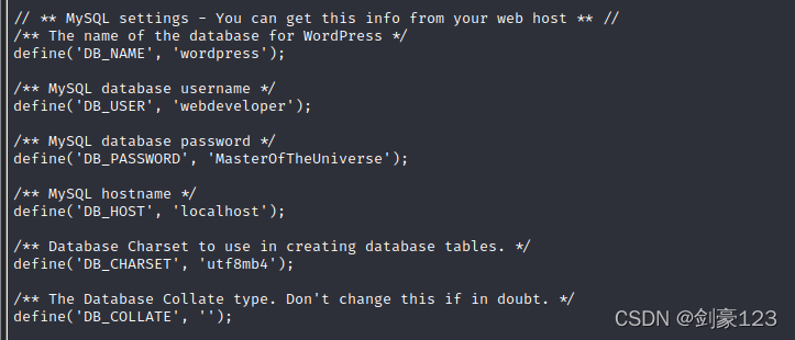 在wordpress的配置文件里面找到数据的用户名:webdeveloper 密码:MasterOfTheUniverse?