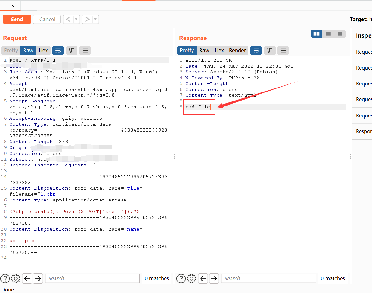尝试直接发送,发现返回bad file  我们要进行后缀绕过,在新版BurpSuite中将所输入字符十六进制HEX转换与以前不同,首先加一个空格,然后右边找到  我们把OA写进去  我们这时再次发送,发现不返回bad file了,成功绕过  接下来访问一下这个文件发现可以访问,说明已经传上去了  还可以到Ubuntu中进行漏洞的查看