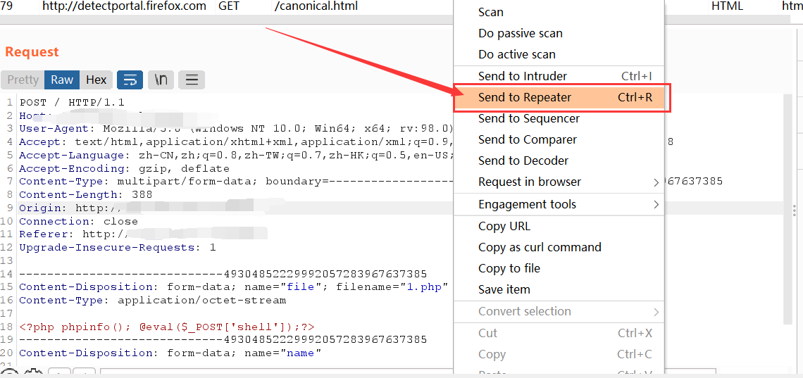 首先找到自己的IP地址,Ubuntu中可用ifconfig命令查Ubuntu看  然后在你所找到的ip后接上8080端口,例如:127.0.0.1:8080,访问进入我们搭建的测试界面  我们首先上传一个PHP文件,抓包测试一下  找到我们抓到的流量  发送到重发器