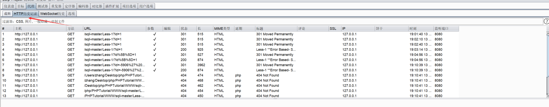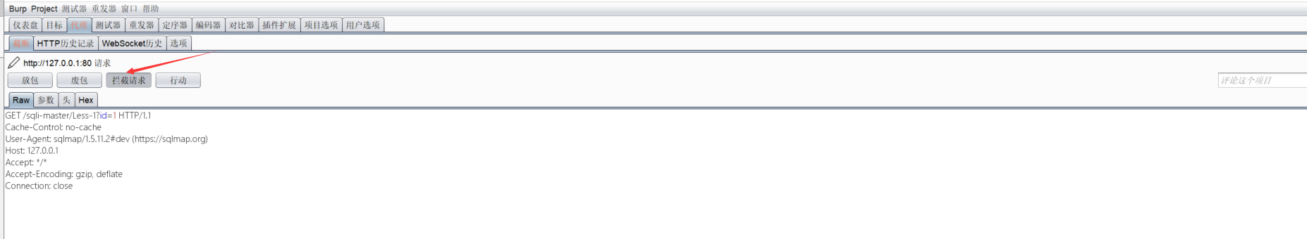 在抓到第一个数据包后关闭拦截,后续sqlmap发送的数据包都会在bp的http历史记录里都有数据。