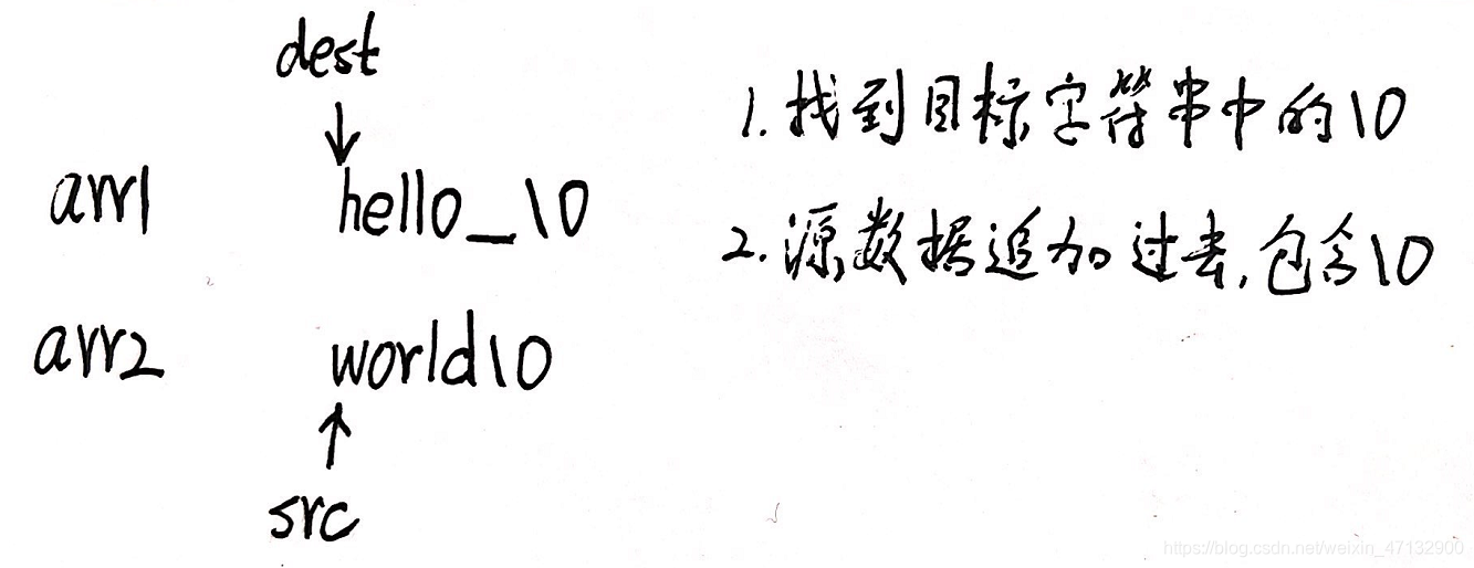 作用:将source所指向的字符串追加到destination所指向的字符串后