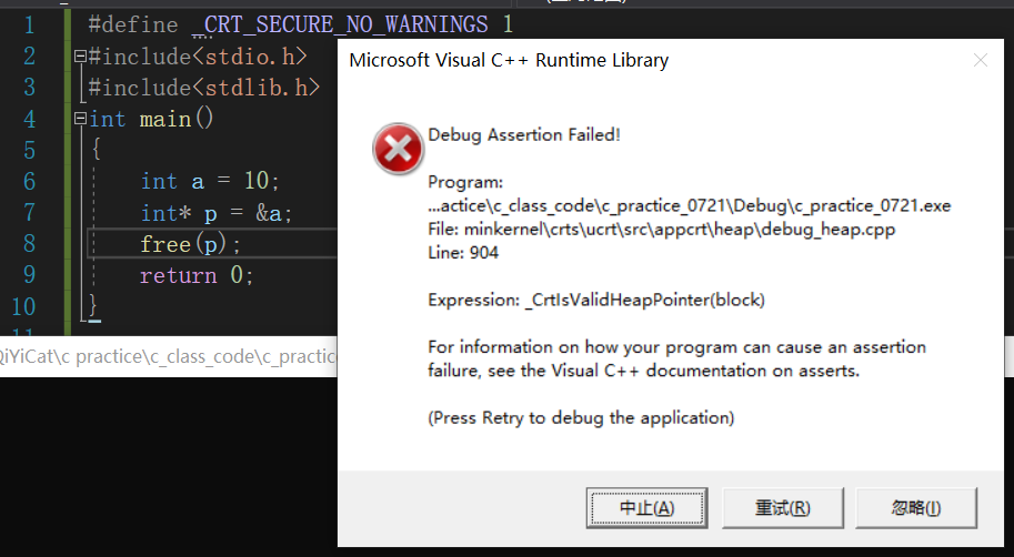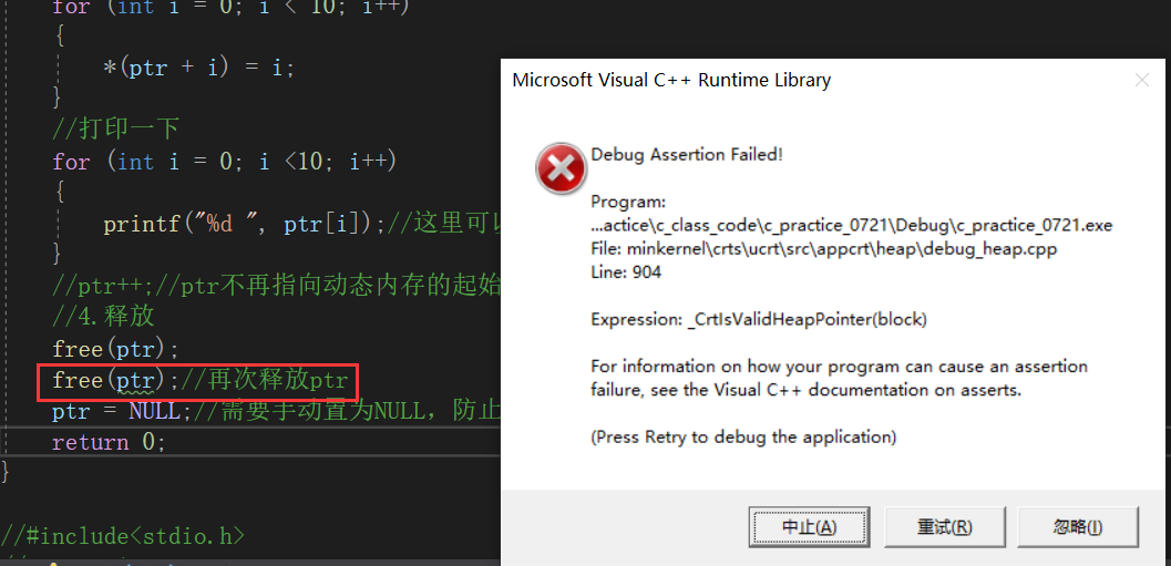 理解:如果参数ptr指向的空间不是动态开辟的,那free函数的行为是未定义的。