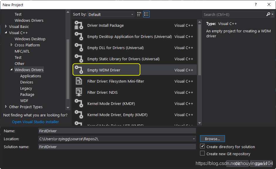 Visual C++ > Windows Drivers > Empty WDM Driver, 取名为FirstDriver