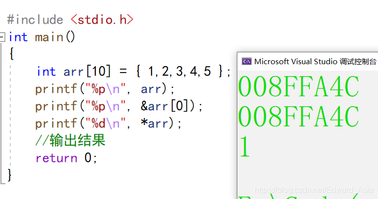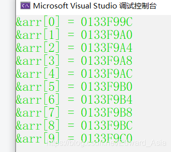 ?仔细观察输出的结果,我们知道,随着数组下标的增长,元素的地址,也在有规律的递增。 由此可以得出结论:数组在内存中是连续存放的。