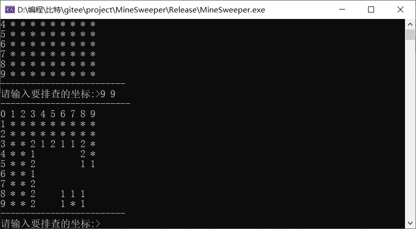 布置好地雷后需要打印界面,为了便于玩家确定坐标,在边界打印了行标和列标,这一功能由DisplayBoard实现