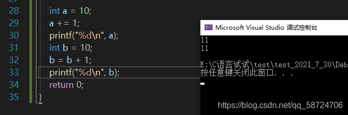 ?? ?int a = 10; ?? ?int b = a++; ? ?//先使用,再++ ? ?a先把10赋值给b,然后a++就变成了11 ?? ?int c = ++a; ? ?//先++,再使用 ? ?a先从11,++变成12,然后赋值给c ?? ?printf("%d\n", b); ?//10 ?? ?printf("%d\n", c); ? //12 ?? ?return 0; }