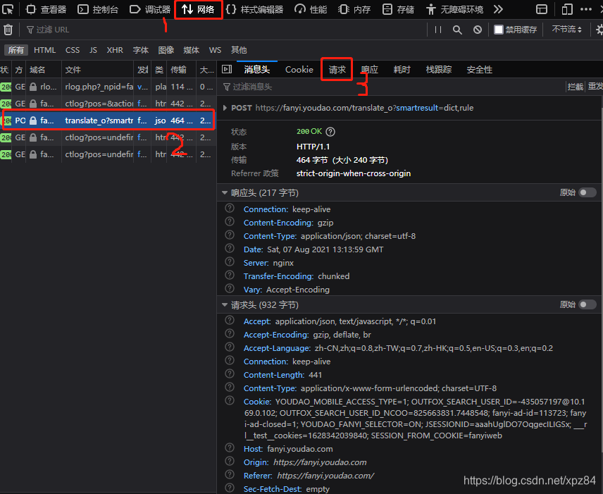 打开有道翻译首页,任意输入一句中文,按F12进入DEBUG模式,点击翻译按钮后按以下截图步骤操作