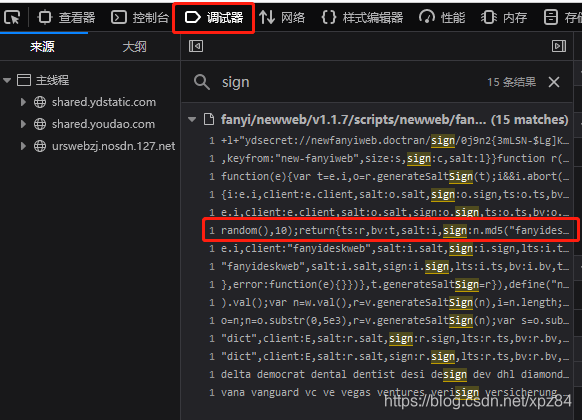 点击”调试器“按钮,来到调试页面,按CTRL+SHIFT+F,输入”sign“进行搜索