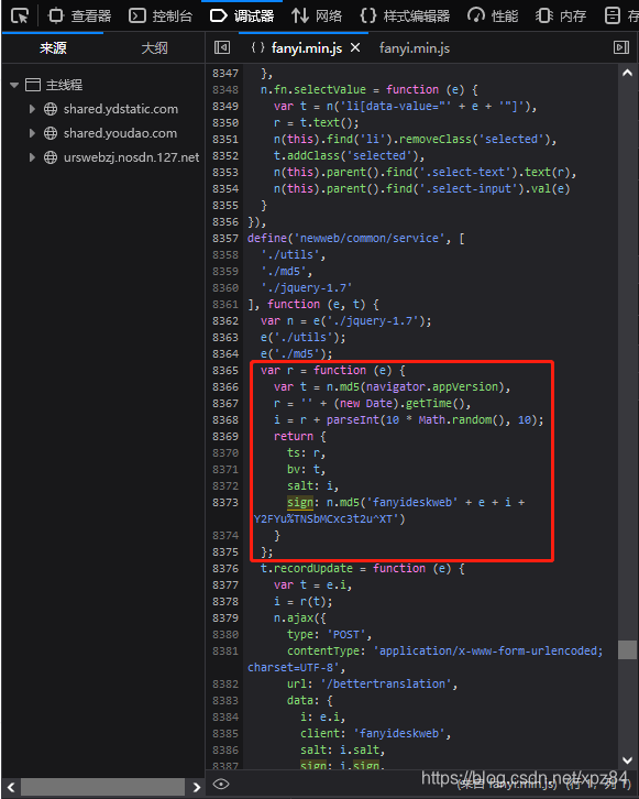 ?发现一个sign 的md5值,如果不知道是哪个,可以一个个点击进去查看,必要的时候下断点,再点击翻译试试看是否会被断下,可以断下的话就很大可能是要找的sign值了。