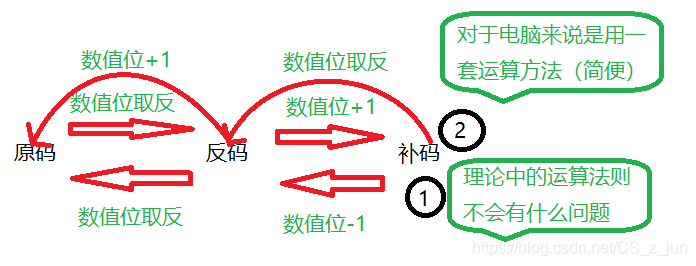 而补码与原码相互转换的运算过程是相同的(共用一套法则)(不需要额外的硬件电路)