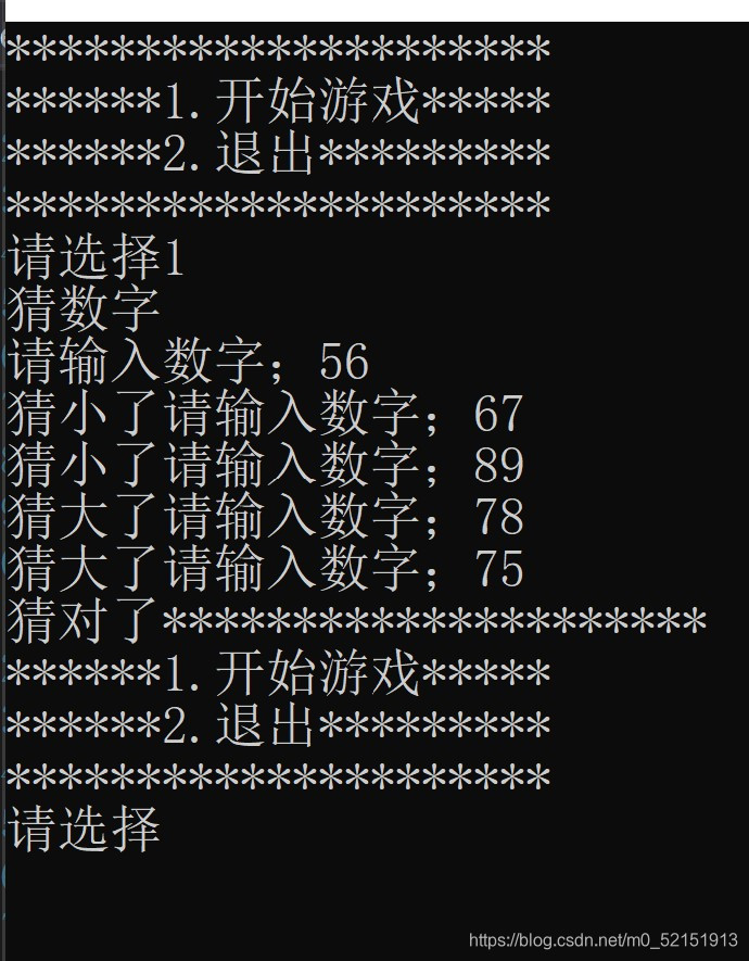 #include<stdio.h> #include<stdlib.h> #include<time.h> void game() { ?? ?int m = 0; ?? ?int ret = rand() % 100 + 1; ?? ?while (ret != m) ?? ?{ ?? ??? ?printf("请输入数字;"); ?? ??? ?scanf("%d", &m); ?? ??? ?if (m > ret) ?? ??? ??? ?printf("猜大了"); ?? ??? ?else if (m < ret) ?? ??? ??? ?printf("猜小了"); ?? ??? ?else ?? ??? ??? ?printf("猜对了"); ?? ?} } void menu() { printf("*********************\n"); printf("******1.开始游戏*****\n"); printf("******2.退出*********\n"); printf("*********************\n"); } int main() { ?? ?int input = 0; ?? ?srand((unsigned int)time(NULL)); ?? ?do ?? ?{ ?? ?menu(); ?? ?printf("请选择"); ?? ?scanf("%d", &input); ?? ??? ?switch (input) ?? ??? ?{ ?? ??? ?case 1: ?? ??? ??? ?printf("猜数字\n"); ?? ??? ??? ?game(); ?? ??? ??? ??? ?break; ?? ??? ?case 0: ?? ??? ??? ??? ?printf("退出游戏\n"); ?? ??? ??? ??? ?break; ?? ??? ??? ?default: ?? ??? ??? ??? ?printf("选择错误,重新选择\n"); ?? ??? ??? ??? ?break; ?? ??? ?} ?? ?} while (input!=0); ?? ??? ?return 0; }